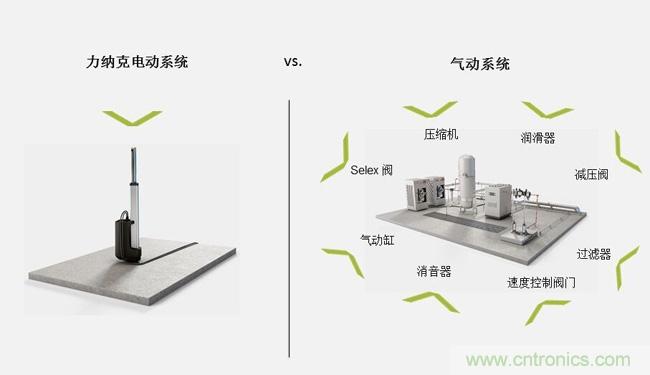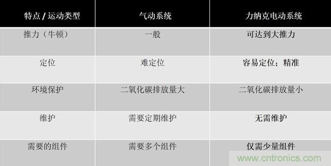 与气动相比有多种突出优势,下图是力纳克电动系统和气动系统进行的简单比较:
