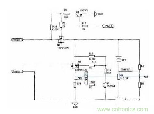 根据三路AD采样结果确定充电器的充电状态后,由单片机输出两路占空比可调频率为1kHz的PWM波形PWM1和PWM2分别用来控制两只三极管2N5551的导通程度,三极管集电极电流会随着不同,再经电阻分压后提供不同的电压给场效应管的栅极,驱动MOSFET,输出不停大小的漏极电流Id,给蓄电池提供大小不等的充电电流和放电脉冲幅值,最终达到脉冲充电的效果。
