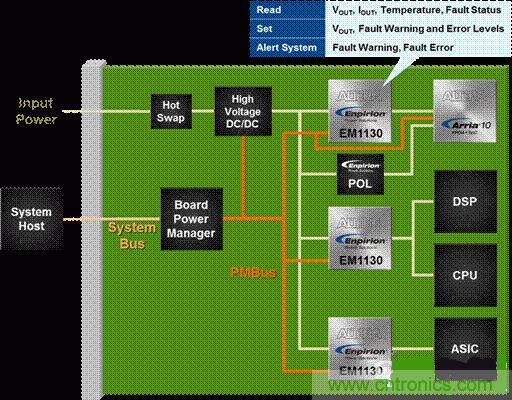(2)另一常见的系统电源要求是能够进行远程监视,对电源各参数进行实时监视、故障报警和相应调节。而最简单、最便宜、最紧凑的方式是使用集成了远程监视功能和相应的通信总线的电源调节器。通过智能电压ID(SmartVID)特性,Altera的Arria 10 FPGA和SoC通过PMBus接口,确定与Enpirion电压调节器系统之间所需的VCC电压和通信,将内核电压轨尽可能动态调整到最小,而不会牺牲系统性能。同时,支持PMBus的Enpirion的ED8101P0xQI单相数字控制器,与ET4040QI大电流电源配对使用,可实现对FPGA的多种远程监视和低功耗特性。