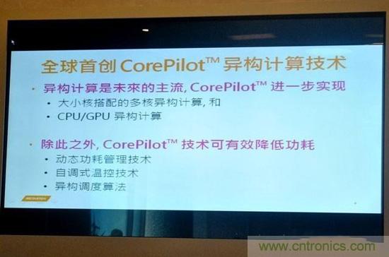 联发科CTO周渔君曾表示:“现在影响手机的体验并非手机处理器的性能,而是电池的使用时间,我们的CorePilot技术可以分配不同任务让不同的核心处理,这就让功耗与性能得到了完美的统一”