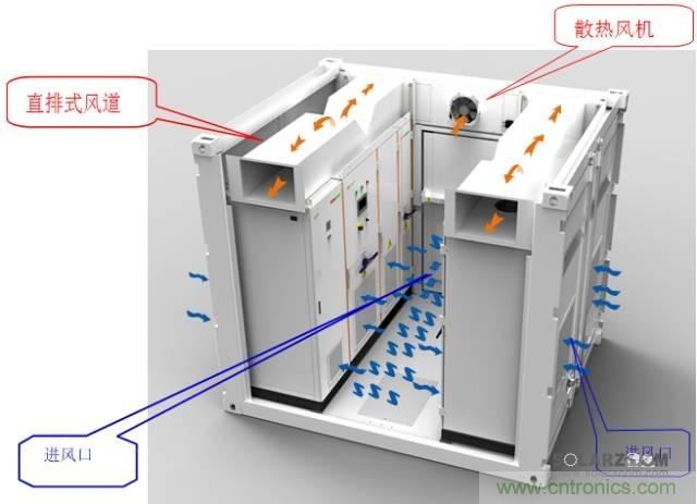 阳光电源箱式逆变房将逆变器、直流柜、通讯单元集成于一体,采用简洁的分段直排式风道,风道内不含风机,零损耗,免维护。风道长度仅1m,压力损失小,风机处于最佳效率状态。逆变器在工作时,大部分热量通过风道排出集装箱外,仅有少量热量通过辐射传到箱体内部,内部空气吸收热量后向顶部流动,再由集装箱顶部排风扇排出,确保了逆变器的长期可靠运行。