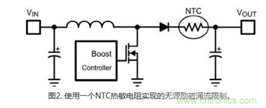 最简单的限流机制是采用一个负温度系数 (NTC) 热敏电阻(图2)。由于在冷却时出现高阻抗,NTC在开始启动时限制励磁涌流。其自身功率耗散所导致的自发热可使阻抗下降,从而能够使更多的电流流过。这个方法的优势在于简便易行且成本低廉。然而,在恶劣条件下使用这个方法会带来某些缺点。比如,在汽车发动机舱等温度大幅变化的环境内,会出现使NTC初始阻抗降低的高环境温度;此外,如果不仔细管理整个环境运行条件,就会导致过多的励磁涌流。如果出现重新启动的情况,NTC器件温度也许会在下一次加电之前尚未冷却。在输出电容完全放电时,由于散热速度较慢,NTC对于励磁涌流的限制会变到最低。此外,如果负载出现短路故障,NTC将无法限制比所选标称运行条件高的电源电流。最后,NTC方法对于单一功能保护有效,但是由于使用的是无源组件,这个方法也会受到某些限制。