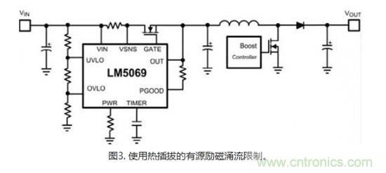 选择像MOSFET这样的主动限制装置需要一个励磁涌流限制控制器的控制电路,它也被称为热插拔控制器或电子熔丝。这是一个位于升压控制器之前的附加集成电路 (IC),很多此类的控制器(图3)特有包含电流和电压环路的可编程涌入限制,旨在确保MOSFET保持在安全工组区 (SOA) 内的同时,控制涌入率。SOA用于监视维持关键?;て骷某て诳煽啃浴4送?,涌入控制器会具有两个电流阀值:一个用于规范涌入限制,第二个是在严重过流情况下用于完成断路器功能。这种方式的一个明显优势就是你能够实现它的先进?;ぬ匦裕蝗欢?,通常来说,这个解决方案的成本和复杂度要高于无源方法。