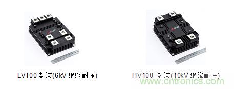 首次亮相展会的X系列双管HVIGBT???,采用CSTBTTM 结构的第7代IGBT和RFC二极管,降低功率损耗;运用可降低内部电感的封装技术,优化产品性能;使用两种封装(LV100/HV100),实现两种绝缘耐压(6kV/10kV),但两者具有相同的外形尺寸。LV100封装包括900A/1.7kV和450A/3.3kV;HV100封装包括450A/3.3kV、330A/4.5kV和225A/6.5kV;可提高系统结构设计的灵活性,方便实现逆变器扩容。