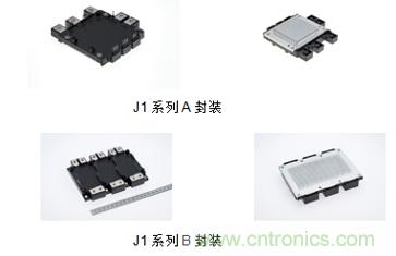 J1系列汽车用IGBT??槭亲ㄎ缍登?,及高可靠性逆变器设计,采用Pin-fin底板的六合一汽车用IGBT???。它使用第7代IGBT硅片技术,损耗更低;高可靠性的DLB(直接主端子绑定)技术;及基于硅片的温度和电流检测技术。J1系列提供A、B两种封装。A型封装(小封装)有300A/650V、600A/650V、400A/900V和300A/1200V;B型封装(大封装)有1000A/650V和600A/1200V,这两种封装可以满足从小型电动汽车到大型电动公交车的应用要求。
