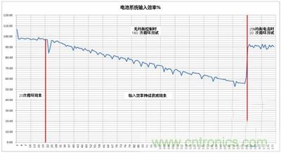 图1中,关闭主动均衡控制的160次循环测试中,前20次的输入效率保持在95%以上,一个非常平稳的输入效率,这就是“首20次循环现象”;在20次以后的测试中,电池系统的输入效率随充放电次数下降(充电和放电条件不变),在第40次时,约为90%,在第70次时,约为80%,在100次时,已经降到70%,而在第160次时,约为55%。