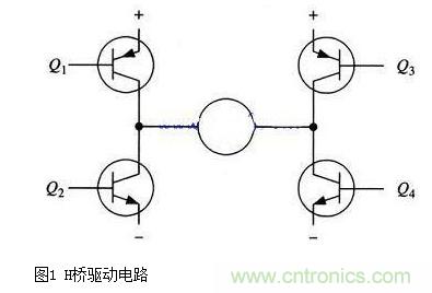 图1中所示为一个典型的直流电机控制电路。电路得名于“H桥驱动电路”是因为它的形状酷似字母H。4个三极管组成H的4条垂直腿,而电机就是H中的横杠(注意:图1及随后的两个图都只是示意图,而不是完整的电路图,其中三极管的驱动电路没有画出来)。