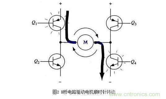 要使电机运转,必须使对角线上的一对三极管导通。例如,如图2所示,当Q1管和Q4管导通时,电流就从电源正极经Q1从左至右穿过电机,然后再经Q4回到电源负极。按图中电流箭头所示,该流向的电流将驱动电机顺时针转动。当三极管Q1和Q4导通时,电流将从左至右流过电机,从而驱动电机按特定方向转动(电机周围的箭头指示为顺时针方向)。