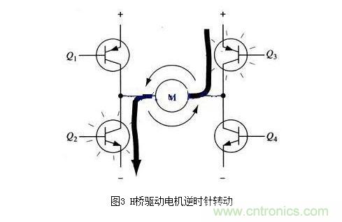 图3所示为另一对三极管Q2和Q3导通的情况,电流将从右至左流过电机。当三极管Q2和Q3导通时,电流将从右至左流过电机,从而驱动电机沿另一方向转动(电机周围的箭头表示为逆时针方向)。