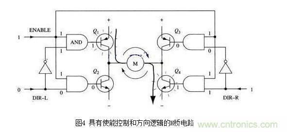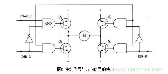 改进电路在基本H桥电路的基础上增加了4个与门和2个非门。4个与门同一个“使能”导通信号相接,这样,用这一个信号就能控制整个电路的开关。而2个非门通过提供一种方向输人,可以保证任何时候在H桥的同侧腿上都只有一个三极管能导通。(与本节前面的示意图一样,图4所示也不是一个完整的电路图,特别是图中与门和三极管直接连接是不能正常工作的。)