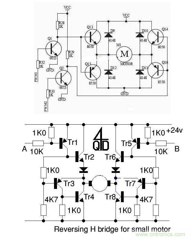 【导读】电路得名于“H桥驱动电路”是因为它的形状酷似字母H。4个三极管组成H的4条垂直腿,而电机就是H中的横杠。