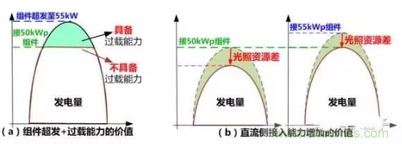 如正面案例所述,当辐照度或温度等环境条件变化时,组件输出功率会超过规格书中标定的最大功率,即“组件超发”,此种情况通常发生在部分光照资源较好的部分Ⅰ类资源区,这就要求逆变器需具备将组件能量全部转化的能力,即对逆变器“吐”的能力要求较高。否则将会出现弃光的现象,降低发电量,影响用户收益,如图2(a)所示。