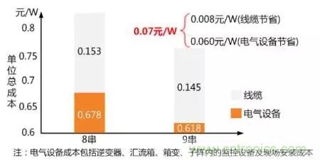 上述分析仅仅是考虑了光照资源,但在实际光伏系统中,由于灰尘遮挡,组件输出至少降低2-3%,再考虑到组件衰减、电缆损耗等因素,实际传输到逆变器输入端的直流功率又会减少5-10%左右。此外,根据1.6MW典型系统设计方案成本计算表明,50kW组串式逆变器直流侧接9串方案比8串方案,逆变器数量减少了12%以上,可节省系统初投资0.07元/W,100MW可节约初始投资700万,这便是逆变器较高的“吞”能力带来的好处,如图3所示。