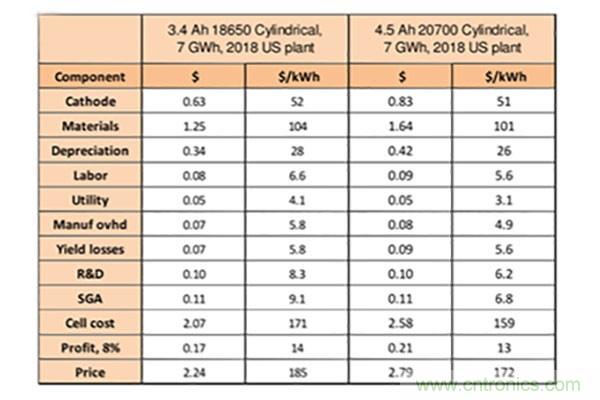 Tesla公开说明选择20700的优势:“If the new meets the same life and safety requirements, once it is produced at the same yields and at high volume, it will offer about 3-4 % increase in energy density and a 7 % reduction in cost”,即在达到与18650同样的良率和产能后,能带来能量密度增加和成本下降两个优势,这从下表中也能得到充分体现。
