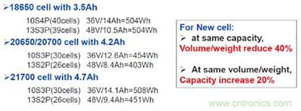采用20700 /21700 /20650后,由于同等能量下,电池数量减少(以21700为例,减少1 /3),这会带来整个Pack内部金属连接件数量的减少,这会进一步降低电池Pack的质量。