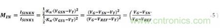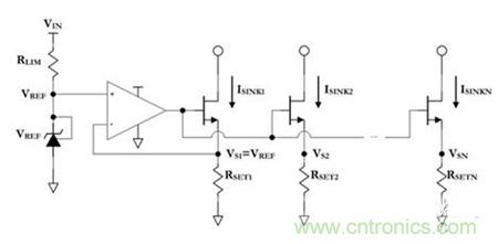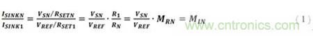 最终MOSFET(金氧半场效晶体管)源电压VS以及RSET电阻决定着各柱上的灌电流(sink current);通过去除来自外部电流沉柱的反馈(即所有N》1),已失去对VSN的直接控制。因此,RSETN必须精心选择以生成预期的任意第N个柱的灌电流,即ISINKN。仔细观察上面的图1,很容易得出定义偏置网络第N个柱电流与第1个柱电流的比值的等式︰