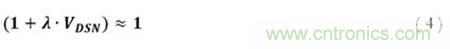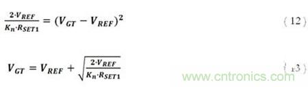 必须注意的是,这里可以很大程度上忽略通道宽度调制的影响。这是因为任何因漏极电压上升导致的漏极电流的上升会在通过RSET电阻后下降,并导致源电压的上升。为了使MOSFET能维持任何电流,栅极电压必须大于源电压与阈值电压的和。也就是说,给定一个栅极电压,源电压将被限制在至少比栅极电压小一个阈值电压的值,且再大的漏极电压上升也不会提升漏极电流。因此,构建相应运行条件,RSET必须足够大,从而确保在上述限制下可允许作出以下假设: