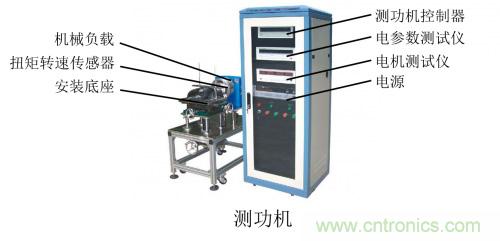 测功机的构造很简单,由一个机柜和测试台架组成,其中测试台架又常称作测功头,一般是指扭矩转速传感器和制动器做成一体的款式。测试台架包括安装底座、扭矩转速传感器、机械负载(制动器),用于电机试验时的力矩加载,模拟电机的不同工况;机柜包括电参数测试仪、电机测试仪、测功机控制器、电源等,用于对系统的驱动和对电机的测试。