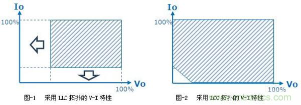 目前大功率恒流LED驱动电源的设计,比较常见的软开关拓扑是LLC,它的输出V-I特性如图-1所示。从图中可见,LLC拓扑的输出电压、电流范围下限都比较高。随着用户对调光要求的越来越高,LLC拓扑的这种输出特性的局限性也越来越明显。如果输出直接恒流,LLC拓扑在恒流时的电压不能够达到很低,即对灯珠个数的适应性有较大局限性;当需要对电压相对固定的特定灯串时进行调光的时候,调光电流在相对较窄的频率范围内不能达到比较低范围。如果需要做到深的调光深度,往往需要间歇工作以达到小的平均电流,甚至采用额外一级DC/DC电流来实现,产生额外的纹波电流或增加系统成本及降低效率。