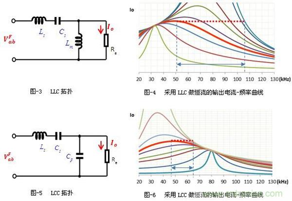 两图中虚线是恒流轨迹线,当负载电阻变化时,工作频率需要做相应的变化使得电流保持稳定不变,从图-4中可以看出,采用LLC拓扑实现恒流输出时,不同负载线之间的间隔较大,意味着频率变化较大。而从图-6中可以看出,采用LCC拓扑实现恒流输出时,不同负载线之间的间隔比较紧密,意味着频率变化较小。也就是说,LCC拓扑实现恒流时,频率随负载变化的范围比LLC的要小很多。