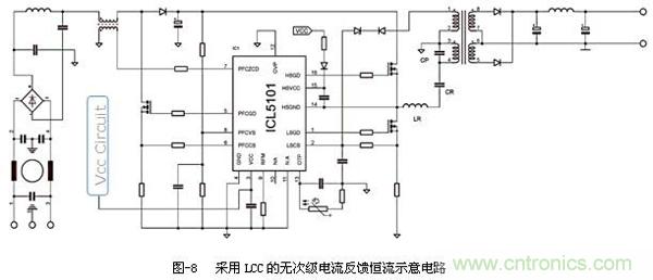 图-8是省略次级电流采样反馈的示意电路,工作在固定频率,整体电路更加精简,整机成本可以与"PFC+反激"拓扑竞争??悸堑叫实纫蛩兀宄杀旧踔粮?。