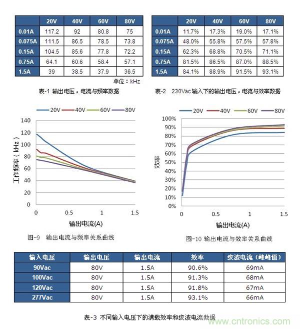 表-1是输出电流与频率在不同输出电压条件下的数据,图-9是根据此数据画出的曲线。整个输出电压(20-80V),输出电流(0.01-1.5A)范围内,频率的变化范围也只有80kHz左右的变化。特别是恒流在最大电流时,频率的变化范围只有几kHz,恒定电压在80V调光时,频率范围是39kHz左右。