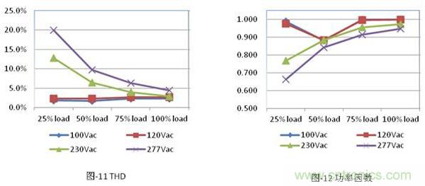 另外,ICL5101的THD和PF性能也很出色,详细数据分别如图-11和图-12所示。100%负载下,THD可低于5%。甚至在50%负载及277Vac条件下,THD小于10%,远低于EN61000-3-2 class C要求。