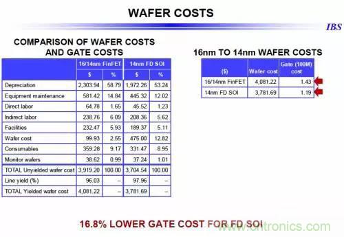IBS 首席执行官Handel Jones则比较了16/14纳米FinFET与14纳米FD SOI的晶圆成本与单位晶体管成本,根据他的计算,14纳米FD-SOI工艺单位晶体管成本比相应的FinFET工艺低了近17%。