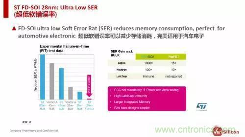 除了低功耗与低成本,FD-SOI工艺在可靠性上也表现出色。沈磊指出,从意法半导体给出的数据来看,由于FD-SOI工艺的敏感体积更小,对闩锁效应(latch-up)免疫,具备更低的SRAM软错误率,以及更好的电磁兼容性,使其更适用于高可靠应用领域,例如汽车、银行与生命维持系统等。