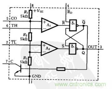 【导读】首先介绍下555的内部电路电路结构,如下,其中,三极管起控制作用,A1为反向比较器,A2为同向比较器,比较器的基准电压由电源电压+Vcc及内部电阻的分压比决定。RS触发器具有复位控制功能,可控制三极管的导通与截止。