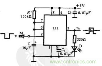 555组成单稳态触发器可以用作触摸开关,电路如下,其中M为触摸金属片或者导线,无触发脉冲输入时,555的输出V0为“0”,发光二极管D不亮。当用手触摸金属片M时。相当于端口2输入一个负脉冲,555的内部比较器A2翻转,使输出V0变为高电平“1”,发光二极管亮,直至电容C上的电压充到Vc=2Vcc/3为止。二极管亮的时间Tp=1.1RC=1.1s。下图中电路可用于触摸报警,触摸报时,触摸控制等,电路输出信号的高低电平与数字逻辑电平兼容。图中,C1为高频滤波电容,以保持2Vcc/3的基准电压稳定,一般取0.01uF, C2用来滤波电源电流跳变引入的高频干扰,一般取0.01uF ~0.1uF.