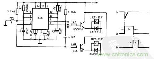 如下是由一片556(双555)组成的两级定时器电路,第一级定时器被开关S触发时产生延迟脉冲A驱动继电器K1, A的延迟时间 t1 = ~1.1 R1xC 1