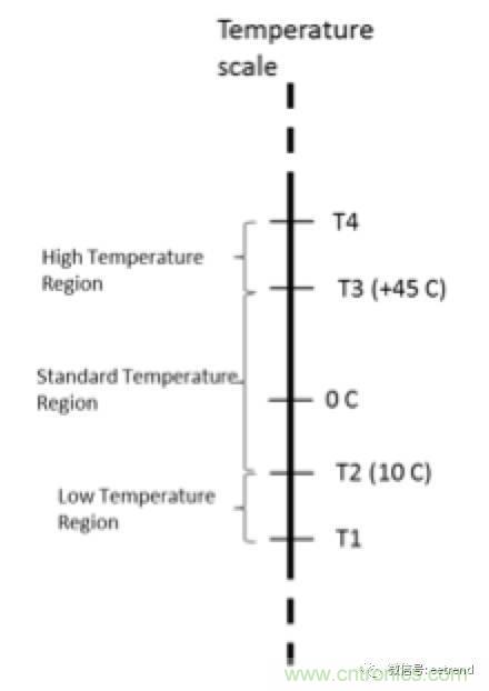 如图1所示,JEITA规范定义了最低温度(T1)、最高温度(T4)和位于二者之间的三个温度区(低、中、高),以确保充电安全。