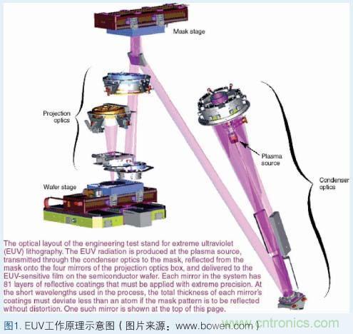 EUV的基本工作原理:激光对准氙气喷嘴。当激光击中氙气时,会使氙气变热并产生等离子体;一旦产生等离子体,电子便开始逃逸,从而发出特定波长的光;接着这种光进入聚光器,然后后者将光汇聚并照到掩膜上;通过在反射镜的一些部分施加而其它部分不施加吸收体,在反射镜上形成芯片一个平面的图案的光学表示,这样就产生了掩膜;掩膜上的图案被反射到四到六个曲面反射镜上,从而将图像微缩,并将图像聚投到硅晶圆上;每个反射镜使光线稍微弯曲以形成晶圆上的图像,这就像照相机中的透镜将光弯曲以在胶片上形成图像一样。