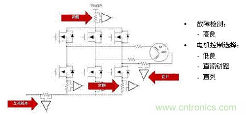 如图1所示,基本上有三种不同的方法来测量三相电动机驱动系统中的电流:低侧、直流链路和直列测量。图1所示的是传统三相PWM逆变器,该逆变器使用三对功率MOSFET(绝缘栅双极晶体管IGBT也很常见)来驱动直流电动机。该图还包括高侧电流感应,其通常在显著错误情况下使用,比如接地电路短路的情况。