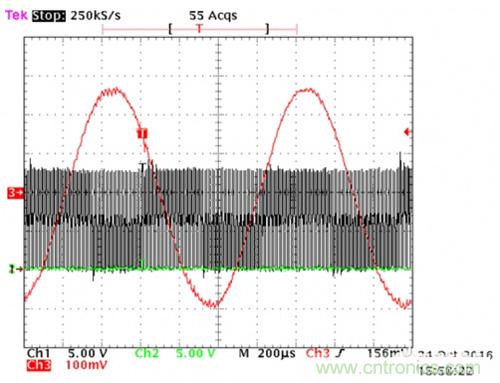 直列式电流感应方法看似是最合理的,因为这是最终要测量的电流。但这种方法存在一个问题。驱动MOSFET或IGBT的PWM信号对电流感应放大器造成严重破坏。感测电阻处的共模信号从电源电压被驱动到接地,具有非常快速的瞬态开关特性,而电流感应放大器试图测量感测电阻本身的小差分信号。图2是由PWM逆变器产生的正弦相电流(红色波形)的示波器截图。这种情况下,PWM频率为100兆赫(MHz),由LMG5200 GaN半桥功率级提供(更多详细信息,请参见底部的TI设计)。需要注意的是,快速开关信号是直列式电流感应放大器测量相电流时所接收的信号。这就像在有飓风的情况下,当杯子在海上漂浮,而试图测量杯中液体一样。难怪大多数设计师会考虑使用低侧感应!下面我们将介绍另外一种方法。