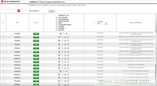 开始设计前,请点击TI WEBENCH设计中心的Power Designer Enabled Devices链接。从顶部列表中选择“Load Switch”(负载开关)选项(参见图 1)。单击“Create”(创建)按钮,WEBENCH工具将打开所选择的负载开关的产品页面。