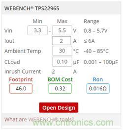 负载开关WEBENCH功能可通过产品页面右侧的WEBENCH组件实现。图2显示了TPS22965负载开关的组件。