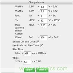 这是WEBENCH设计器工具中最有用的一个控制台,因为它会告诉你特定应用时负载开关预计运行情况。浪涌电流、上升时间、效率、导通电阻和功率耗散只是众多计算结果的一部分。若要改变这些数值,只需在“Change Inputs”控制台中输入新的设计参数即可。这样做可以看到更改设计参数会如何改变负载开关的行为。例如,更改输出电容会影响负载开关的浪涌电流。