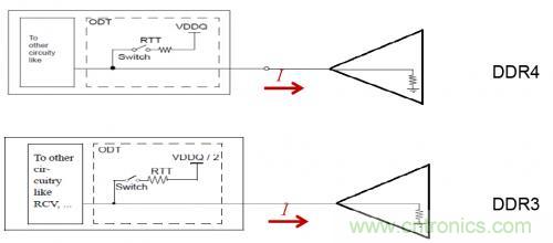 为了直观的看出端接方式的差异对总的功耗的影响,下面分别比较了在输出高和低得情况下,DDR4/DDR3的电流流向。