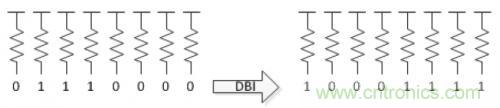 所以,一个降低DDR4系统功耗的方法是,尽量加大DDR4输出高的数量。这个就是为什么DDR4中多了“DBI管脚”。举个例子,当8bit lane中有至少有5个DQ都是低时,所有的Bit将会被翻转,并且DBI(Data Bus Inversion)置低,用来指示数据线的反转。通过这个方法,总共9个信号中(8个DQ和1个DBI),总有至少5个是被驱动为高电平。如果原始的数据中有4个或者更多的信号被驱动为高时,那么DBI信号也将会设为高,同样,还是9个里面至少有5个为高。这样的话,在每一个数据传输的过程中,都是至少有5/9的数据是高电平,可以在一定程度上降低了功耗。