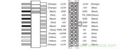主板上的24pin供电接口就用到了PC电源上全部5种供电电压,即+12V、+3.3V、+5V、-12V以及+5VSB,另外还有一个-5V,不过这个电压对应的硬件和接口实际上早已淘汰,因此现在的PC电源已经不再提供-5V供电,在24pin接口中的这一路仅是名义上的存在。