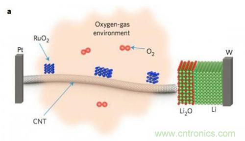环境透射电子显微镜能够在氧气环境下进行工作,从而使得在原子级别对锂氧电池的反应过程进行直接的观测成为可能。实验中Langli Luo利用载有纳米RuO2催化剂的CNT作为正极,金属Li作为负极,金属Li表层的Li2O作为固体电解质,电池结构如下图所示。