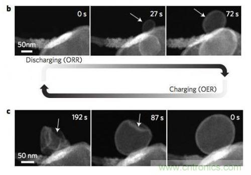 来自美国西北太平洋国家实验室的Langli Luo等人近日利用环境透射电子显微镜对全固态Li-O2电池的反应机理进行了研究,研究显示在CNT表面首先形成LiO2化合物,随后该产物发生歧化反应生成Li2O2和O2,O2的释放生成了一个外层由Li2O构成,内层由Li2O2构成的中空球状结构。目前该型研究成果已经发表在了最新的Natural Nanotechnology杂志上。