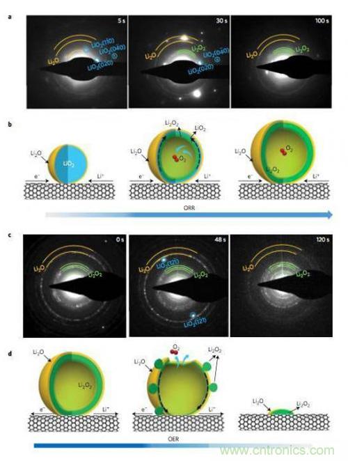 研究显示,初始反应产物LiO2很快会发生歧化反应生成Li2O2和O2,在颗粒内部释放的O2被封锁在了颗粒的内部,从而导致了颗粒成为中空结构,如下图所示。从SAED的分析结果来看,在开始的几秒钟时间内,反应产物中只有LiO2,30秒之后,Li2O2和LiO2开始共存,大约100s后LiO2的衍射峰消失,反应产物只剩下Li2O2和Li2O,TEM分析结果显示中空球的外侧为Li2O,内侧为Li2O2。充电过程则正好相反,开始的时候观察到了Li2O和Li2O2的衍射峰,在48s时出现了LiO2的衍射峰,但是在120s时并没有再出现LiO2的衍射峰,说明LiO2只是Li2O2分解的一个中间产物。整个过程为我们揭示了Li-O2电池的充放电反应途径,在放电的时候,Li+通过电解液扩散到CNT表面,在三相界面发生反应,生成LiO2,然后LiO2发生歧化反应(LiO2?Li2O2+O2),生成Li2O2和O2,反应释放的O2会将反应产物从最初的10nm左右,吹到100nm左右,而在产物的表面由于有丰富的Li+,因此会与O2反应生成Li2O。在充电的过程中,Li2O2首先会失去一个Li+和一个电子,形成LiO2,随后LiO2发生分解,产生Li2O2和O2,然后Li2O2再次失去Li+和电子,如此循环指导所有的Li2O2消耗完毕。