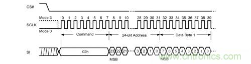 其实,无论是对芯片的擦除,编程还是读取操作,我们大致可以按照以下的套路来:写命令---写地址---写(读)数据。正如以下的时序图一样清晰明了,我们先把片选信号拉低,再发个0x02页编程命令,再发个地址,就可以轻松写数据了。