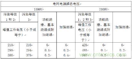 2、首先确定污染等级,再根据实测两点峰值工作电压B和上述确认的交流电网电源瞬态电压值可确定最小电气间隙为C1(由表2K确定);