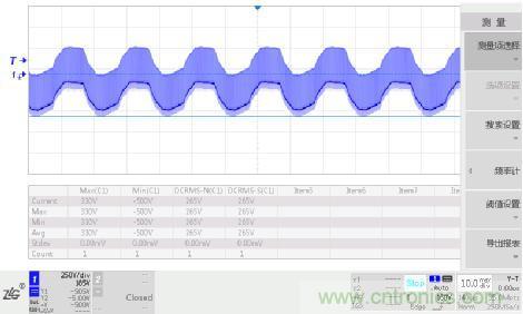 实测100~240VAC输入开关电源初次级最大电压波形如下图3所示,工作电压峰值为500V,工作电压有效值为265V,根据表2J可知交流电网电源瞬态电压为2500V。