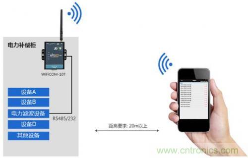 电力补偿装置的巡检一般需要人工开柜进行数据的查看、调整等操作,工作繁琐切具有一定危险性,本项目利用WiFiCOM-10T串口转Wi-Fi??椋诖匙爸玫幕∩侠迷械腞S-485/232通讯接口快速进行产品升级,将串口数据转化成Wi-Fi信号,巡检人员即可通过手机或iPad进行设备巡检,并实现???、遥测、遥信等功能。