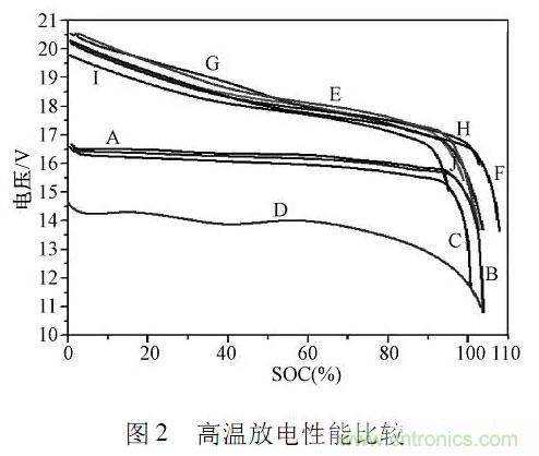 高温情况下,电池内部离子移动速度增大,浓差极化和电化学极化减轻,极化内阻减小,电池内部化学反应热增大,过分高温会使隔膜发生收缩,电解液发生副反应,造成电池寿命稳定性降低GB/T31486要求电池在室温下充满电,55℃高温下储存5h后评价动力电池的放电容量电池样品的高温放电性能比较如图2所示。
